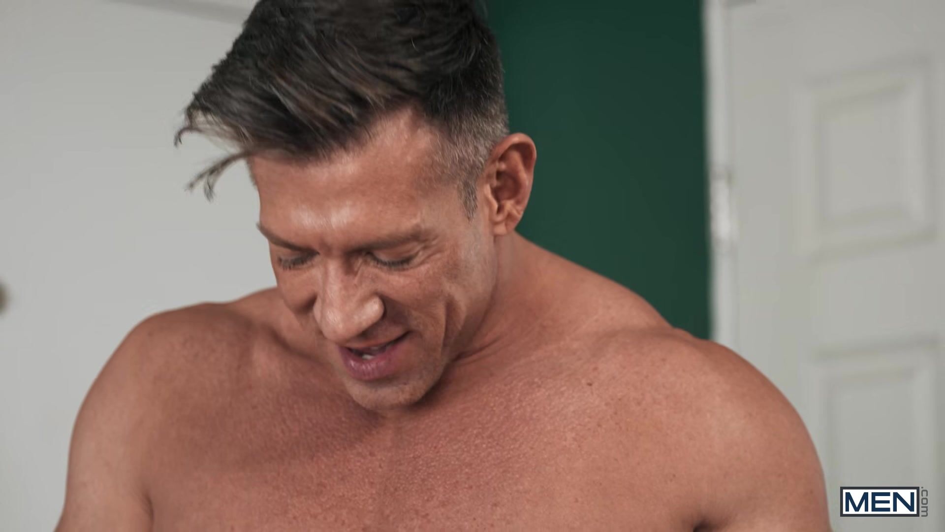 Seth Peterson comes over to his boyfriend Adam Awbride's house for a "study session", but he's a bit distracted by Adam's hot, bossy new stepdad, Bruce Beckham. When Bruce walks in on them after Seth gives Adam a handjob, he pulls Seth out of the room and tries to give him a talking-to... but Seth gives the daddy a blowjob instead! Bruce bends the twink over the bed and tongues his hole, then teases it before he eases his cock inside. Bruce fucks the college guy in spoon and standing doggystyle, then drills him on his back till the bottom cums. Adam walks in just after his stepdad creampies his boyfriend!